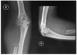 Wide excision and non vascularized fibular graft reconstruction method result was good on three cases described above. The outcome were good on all cases, No impairment of elbow joint motion observed on all three cases in one month period after surgery because there were no lump and pain sensation post operatively. There were no evidence of infection and nerves disorder (Figure 5).