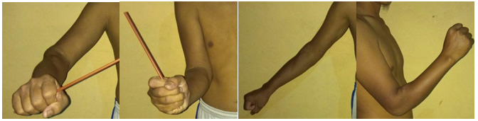There were no signs of recurrence from 1-year follow up of the second patient. He was satisfied with his treatment because he felt no disability. Range of elbow motion was increased, with full pronation and better supination compared to pre-operative condition. Grip strength was good and no complain of pain even when we resisted the motion while examining the muscle strength. Eat with utensil, turn a key, throw a ball, rise from chair pushing with arm and the others daily activities could be done without ease (Figure 6) (Figure 7).