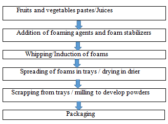 In this paper a review of Foam-mat drying process for fruits and vegetables is discussed to develop quality powders. Foam-mat drying is a new drying technique for foods which are highly heat sensitive and very sticky to dry. Foods contain a lot of compounds which are very sensitive to high temperature for long time. By using this drying technique product is dried in a very short time with minimum quality changes. Fruits and vegetables pastes are mixed with different foaming agents (egg albumin, soy protein, egg white, Lecithin etc.) and foam stabilizers (carboxymethyl cellulose, pectin etc.) in different concentration to introduce stable foams. Foams are dried in trays by application of hot air and milled to develop free flowing powders. Powders developed by this drying technique have maximum preservation of the compounds which are very heat sensitive.