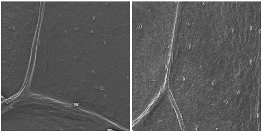 The analysis allows to detect large number of stomata on the sample’s surface as seen in Figure 1, concerning to the first day of storage. Through the captured images it is possible to analyze the surface of the lettuce leaf on the harvest day, presenting smooth surface and the central rib without damage. The SEM images of the top and center samples of the leaf show that the structure of the leaf surface is more elongated, conferring with the studies of Lima.10 The presence of stomata was also detected, and these were open at the time of image capture.