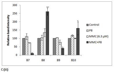 Figure 3C Protein expression profile: (i) SDS-PAGE (Lane L1: Control, Lane L2: P8 treated, Lane L3: MMC 6.3 μM treated, Lane L4: MMC+P8 treated and (ii) Relative band intensity.