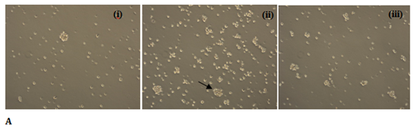 Figure 4 (A) Cellular aggregates (marked) are mutant (tk-/-) cells which survived in trifluorothymidine (TFT) containing media (i) Untreated control, (ii) MMC treated, and (iii) MMC+P8; (B) Antimutagenic potential of HPLC purified peak fraction P8 in thymidine kinase human lymphoblast cell (tk+/-) line.