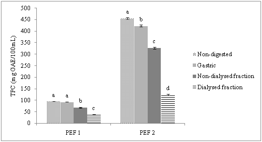 Regarding TPC bioaccessibility the highest value was observed when PEF at lower energy input was applied (40.7%). However increasing the energy input to 364 kJ/kg led to decrease of the TPC independently of treatment applied. This phenomenon could be explained by the formation of highly reactive chemicals.