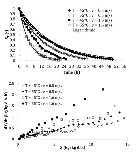 The study of the convective drying kinetics of tomato was carried out using the pilot dryer presented in Figure 1. The used experimental apparatus is a closed loop. The air flow running in the test section is horizontal to the product surface. First, the tomatoes were washed with distilled water and then carefully cut into four quarters. After the setting rate of air flow, the controller starts to heat up to the setting temperature. The air flows into the dryer with the fan; it passes the electrical resistors where it is heated. Once the experimental conditions are stabilized, the sample to dry is placed on the support plate of a balance in the horizontal test section (Figure 1) to establish the drying operation. The drying kinetics were determined from the measurements of the weight variation of the samples over time. These measurements are made using a precision electronic balance digital display. The balance is linked to a computer, and equipped with a data output for the acquisition of the mass over time. The obtained raw results were treated using a Matlab program carried out in this work to eliminate any disturbance caused by air ventilation. This program is founded using the polynomial sliding protocol for 5 by 5 points. The Matlab program calculates also the drying rate. Then the reduced moisture content evolution was presented versus time and the drying rate as a function of moisture content variation; with : equilibrium moisture content calculated by desorption modelling; : initial moisture content. Experiments were investigated on two levels of air temperature (45 and 55°C) and two levels of air velocity (0.5 and 1.6 m/s).