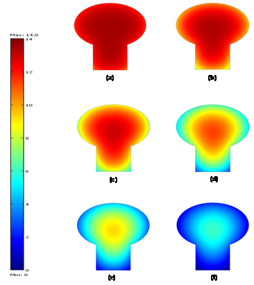Figure 6 Predicted moisture content profile during drying of mushroom at 55°C with different time intervals of (a) 1800s. (b) 3600s. (c) 7200s. (d) 10800s. (e) 14400s. (f) 18000s.
