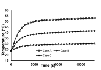 Figure 8 Temperature Profile for different drying temperatures of 55°C (Case A), 45°C (Case B), and 35°C (Case C).