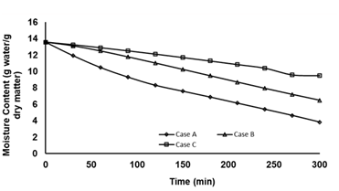 Figure 9 Moisture content profile for drying at different temperatures of 55°C (Case A), 45°C (Case B), and 35°C (Case C).