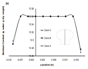 Figure 11 demonstrates the variation of moisture content along the axial direction which pass through the head and stem of the mushroom for different drying temperatures (case A, case B, case C) at various time intervals of 60s, 600s and 6000s, respectively. The negative y‒axis indicate the stem of the mushroom.