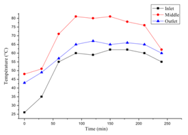 There is a significant difference between the value of the ambient temperature and the temperature at the output of the solar collector (Figure 6), this temperature difference varies from 10 to 33.9°C during the day of the experiment. Knowing that the ambient temperature is between 24 and 32°C for the day considered. The difference is due to the influence of solar radiation on the absorber and to the greenhouse effect, which has results among the absorber and the glass cover, playing an important role in the heating of the air flowing through the air inside the solar collector.