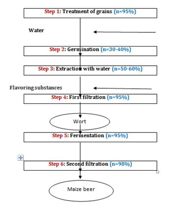 Beer is an alcoholic beverage made by brewing and fermentation from cereals, usually malted barley and flavored with hops and the like for a slightly bitter taste. It is widely consumed throughout the world and global production during the last decade. In Africa, the alcoholic beverages such as liqueurs, wine and especially barley beer are much consumed both during moments of joy (festivals, weddings, success in examinations or competitions, winning football matches, etc.) and moments of sadness (funerals, job losses, poverty etc.). The sale of beer is a significant source of revenue for the owners of the maquis, restaurants etc. It is therefore a creative activity of jobs. According to many works such as “health for all”, barley beer would have many health benefits if it is consumed in moderate amounts. Some of these interesting health benefits would include the following: anti-cancer properties, reduced risk of cardiovascular diseases, increased bone density, diabetes, prevention of anemia, hypertension, anti-aging properties, gallstones, prevention of dementia and coronary disease, aids digestive system, kidney stones and osteoporosis, stress buster, diuretic. But unfortunately, barley beer is imported. To lessen the import costs, we want to produce a local beer that may have the similar characteristics like beer barley beer from another cereal, maize. Unlike barley, maize grows very well in all tropical countries of Africa. Qualitatively, the chemical and biochemical components are almost the same as well as in both barley and maize. There are several types of strains of microorganisms used for the production of beer, such as lactic bacteria and yeast. But we have used a yeast strain: Saccharomyces cerevisiae which we can find easily and cheaply. The manufacturing processes of our maize beer essentially involve treatment of grains, malting or germination, mashing or extraction with water, filtration and fermentation. Germination process is halted at desired malt quality, green brown malt is converted to stable, storable product, colour and flavor are developed, enzymes are stabilized and preserved, and unwanted flavours are removed.
