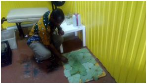 Germination: 5kg of water have been removed in a bucket from the soaking. The germination took place on plastic sheet at 30°C/72h. The maize was recovered with non toxic vegetable leaves (cleaned before in a bleached solution) in order to retain moisture. The cereals were humidified twice per day. Fermentable sugars resulting from starch hydrolysis can be tested by Trommer’s reaction with the formation of Cu2О precipitation of red-brown colour.