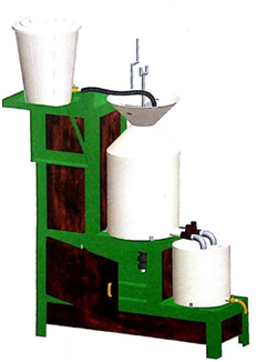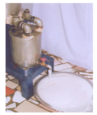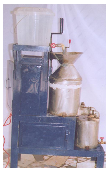 The sieving operation was achieved by tightening back the two nuts to the central shaft, in order to allow the rotation of the perforated drum and central shaft together.Water is released into the system from water tank mounted on the side of the machine frame. Due to centrifugal force generated, the milled starch/milk is seperated from the paste by passing through the sieve (muslin cloth) and collected in the collection tank. The system was allowed to run for 30 seconds before switched off when water in the water tank has reached the desired level. The outletvalve of the starch tank is opened and milled starch/milled is then received as shown in Figure 5. The cover is then unscrewed and swung for the residue to be packed out, and the system cleaned for the next operation.
