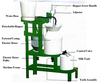Grain beverages are processed from legumes and cereals such as soya beans, maize, rice, sorghum, millet among others.1,2 They are rich sources of vitamins, minerals, carbohydrates, fats, oils, and protein. Grains beverages include soya milk, grain milk, ogi and kunu products among others. These beverages are among the most widely consumed food products in many developing countries and play very important role especially in the socio-economic and health promoting aspect of the people. It is in recognition of this fact that the federal and various state governments are encouraging the establishment of cottage industries to process these products by utilizing local raw materials to supplement the production capacity of the giant industries. The development of appropriate technology in the country for processing grains beverage in the agricultural sector cannot be over looked. According to Gbabo et al.1 the basic methods of grain beverage production are traditional and the modern methods. The traditional method was reported by Gana et al.3 to be tedious, time taking and predispose the product to contamination. On the other hand Fayose4 reported that the industrial method involved the use of equipments which are sophisticated to operate and maintain by small and medium scale processors. Generally, the processing unit operations involved in grains beverage production are almost similar despite the method employed. It comprised of the following major unit operations: cleaning, steeping, wet milling, wet sieving, mixing and cooking. Among these processing operation, wet milling, mixing and wet sieving greatly affect the quality of the final product produced. A lot of research work has been conducted on design of equipments for size reduction of grains, and on design of mechanical sieving equipments. However, very few work were conducted on development of machine that integrate these operations together and finished in one go.3 It was reported by Shakiru et al.5 that available equipments used for wet milling of grains include burr mill, plate mill, disc mill and hammer mill. These equipments are generally made from mild steel materials which can easily become rusted and cause contamination of food material, thereby reducing the quality of the product. According to Fellows,6 Earle7 these equipments are difficult to disassemble for sanitation and cleaning operation. Foyose4 reported that the production steps of grains beverage are carried out in separate stages using different equipment, which makes the process tedious, time consuming and predisposed the product to contamination. In addition, the few existing wet sieving machines are only available in large scale industries which are too sophisticated to operate and maintain by local processors. An automated grain beverage processing machine that is capable of integrating several operations (blending of soaked grains, mixing the slurry, extracting the aqueous liquid and discharging of the paste out of the machine) together and finished in one go was developed by Gana et al.3 However, the machine was observed to have some shortcomings which include no provision of alternative source of power as such the machine cannot be use in rural area where there is no source electricity. Also sometime the machine stop suddenly when in operation due to power sag, that is decrease in the voltage level below the designated level for a duration of up 1minute,8 this sometime occur when the 5 hp electric motor is switch on by the control system. The problem of power sag may be peculiar to only some Africans countries like Nigeria where the power supply is inadequate. Therefore this research into development of batch grain beverage processing machine is therefore set out to achieve both blending of grains, mixing of the slurry with water and sieving of the milk in order to alleviate some of these difficulties and shortcomings associated with the existing grains beverage production machine.