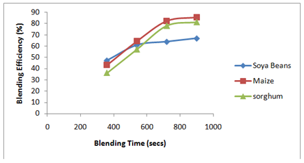Result of the first testing: The effect of blending time on blending efficiency of the various grains is presented in Figure 7. Blending dehulled white maize for 900seconds has the highest blending efficiency of 85.56%, while blending the same dehulled white maize for 360seconds has lower blending efficiency of 43.23%. The least blending efficiency of 36.23% was obtained from processing sorghum for 360seconds.