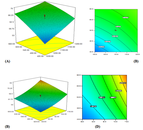The response surface and contour plot for blending expelling with respect to blending time and blade area of contact are shown in Figure 7 respectively. The blending efficiency increased from 57% to 61.76% with increased in blending time from 420sec to 660seconds. This could be as result of more number of beatings and cutting of the grains during blending for 660seconds. Also the blending efficiency increased from 55% to 69% with increased in blade area of contact from 0.00068m to 0.00116m. The high blending efficiency observed with blade with higher area of contact could be as result of more contact between the blade and the grains.