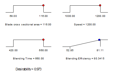 The optimization of the machine functional parameters; blade area of contact, blending time and speed of blending was carried out using numerical technique in rsm with the goal of maximizing the blending efficiency. The ramp of the optimization process is shown in Figure 8 with optimum values of 1.16x10-3m2 for blade area of contact, blending time of 600secs and speed of 1200rpm. On the other hand blending efficiency and desirability of 80.32% and 0.973 respectively were also obtained Figure 9.