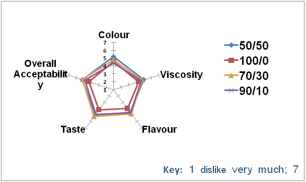 Sensory evaluation: Sensory Evaluation was conducted using 49 panelists. Each panelist was given 25 ml each of the four beverages. The panelists assessed their preference for colour, taste, flavour, viscosity and overall acceptability of each beverage using a 7-point hedonic scale ranging from “dislike very much” to “like very much. Water was provided to rinse the mouth after each sample assessment.
