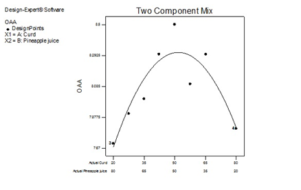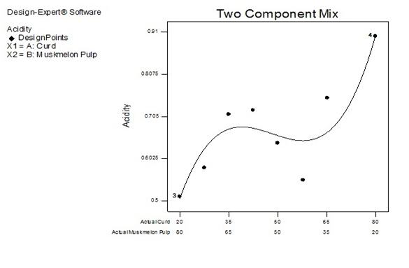 The responses of these models can be plotted as a function of two components in the mixture keeping the total as 100. The variation in overall acceptability with varying contents of lassi and pineapple juice in the blend has been depicted in Figure 2. The common operation in manufacture of fruit lassi is to blend lassi and fruit components followed by proper heating and packaging. To minimize heat induced precipitation of proteins pH adjustment is necessary.20 Acidity of the blend decreased as proportion of muskmelon pulp increased. Reverse trend was observed in case of pineapple juice when blended with lassi. This may be due to the higher acidity of pineapple juice in comparison with the sweet curd used in study. Higher proportions of pine apple juice imparted more tartness and thicker consistency which was not liked by the panel. Samples which contained more of lassi lacked in colour. Higher proportions of musk melon pulp imparted predominant musky taste and thicker consistency which was not preferred by the panel. Musk melon lassi contained more of lassi lacked in colour. Pineapple lassi was found to be more acidic, musk melon lassi was found to be thicker in consistency. In case of pineapple lassi, heat treatment of pineapple juice prior to mixing with lassi was very essential to inhibit the bromelain enzyme and hence to avoid bitterness. Cold mixing of lassi with pineapple juice result in a bitter product which is not sensorily acceptable. The changes in colour (ΔE) during freeze drying were more pronounced in case of pineapple lassi powder than musk melon lassi powder.