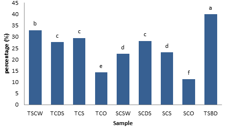 The consumer acceptability of cocoa based beverage produced from Tigernut milk and soymilk with different sweetening agents is illustrated in Table 6. The appearance, Taste, mouth feel, Aroma and overall acceptability ranged as follows; 6.22 in SCSW – 8.52 in TSBD, 4.22 in SCSW -8.02 in TSBD, 5.00 in SCSW -7.08 in TSBD, 6.40 in SCSW–7.30 in TSBD and 6.02 in in SCSW-8.86 in TSBD respectively. It was observed that all the samples scored high in appearance and Aroma. However, samples TCO and SCO had the least score in taste and overall acceptability probably due to absence of sweeteners. Based on overall acceptability, the control sample TSBD scored highest (8.86) followed by TCDS (7.90). The disparity in these two samples could be due to the difference in food composition, processing and familiarity in the taste of the control samples by the panelists.