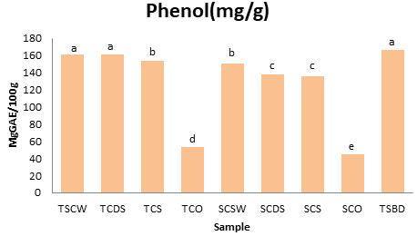 Determination of total phenolic content: The total phenolic content of the sample was determined as described by.20 0.2ml of the sample was mixed with 2.5ml of 10% folin ciocalteaus reagent and 2ml of 7.5% sodium carbonate. The reaction mixture was subsequently incubated at 45oC for 40 mins, and the absorbance was measured at 765nm in the JENWAY UV- Visible sourced from Germany. A standard curve was prepared and used to translate the measured absorbance valued to gallic acid equivalents (GAE).
