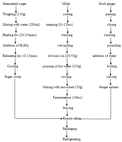 Several studies have established and reported that KZ is a product of lactic acid fermentation.4,8 KZ is a product of cereals and spices, such as the ginger and black pepper, and sugar; some home producers add sweet potatoes in the production of KZ to improve its taste and sweetness.4 And it is produced at cottage level by most house wives to support the income of the family, and it is commonly consumed among the people domiciling in the northern parts of Nigeria. KZ is usually sold at schools and markets.4 Also, an attempt to package and commercialize KZ has been in progress,25 and packaging of KZ can be successfully accomplished if it is properly prepared. The objective of this study is to produce safe and quality KZ prepared from the slurry of Millet, sweetened with inverted sugar syrup and spiced with suitable ratio of Ginger solution concentration.