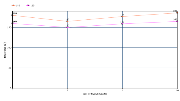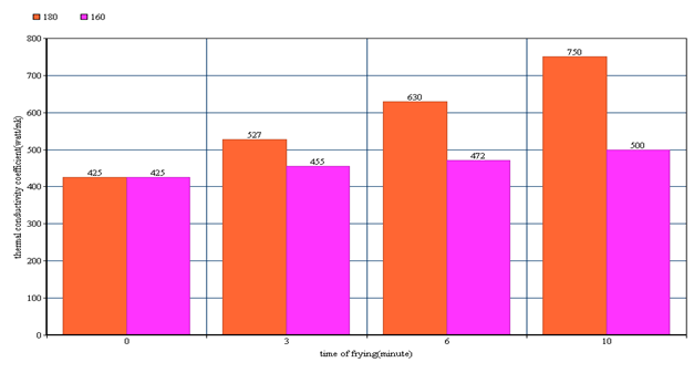 Our results revealed that temperture of frying at 180°C had more oil uptake than temperture temperature of 160°C. As it can be seen in Figure 1, potato weight (gm) were increased with increase of frying times, at time of frying (10 minute) potato weight of potato were reached minimum. For two size of potato, weight loss % were 64% and 58% for frying temperture of 180°C and 160°C respectively with significant deference (p<0.05).9 Similar results were obtained at frying temperture 160°C and 170°C. On the other hand, loss of water is expected for two temperture but result of other researchers was for other variety of potato and less time of frying. This result was significant (p<0.05). In Figure 2, temperture of oil at first decreased untill 3 minute of frying and increased from 3 to 10 minute for two tempertures 180 and 160°C, but were more at 180°C. This difference were non significant (p>0.05). Our result showed that temperture of oil was higher 180°C than 160°C of frying. Thus oil uptake was higher at temperture of 180°C (p<0.05). Considering crust evaluation, temperture of 180°C were related the highest thickness at 10 minute of thickness were 1.5 and 3.1 mm for 160°C and 180°C respectively this diferent were significant (Figure 3). Although thickness of crust was higher at 180°C but at 160°C was enough. Thermal conductivity coeffient were 750 and 500 wat/mc for 180°C and 160°C respectively, which were significant (Figure 4). At last, we resulted the best temperture of frying were 160°C for 10 minute for production of law fat french fries potato. Oil uptake % were 28% and 23% for 180°C and 160°C respectively (p<0.05) (Figure 5).