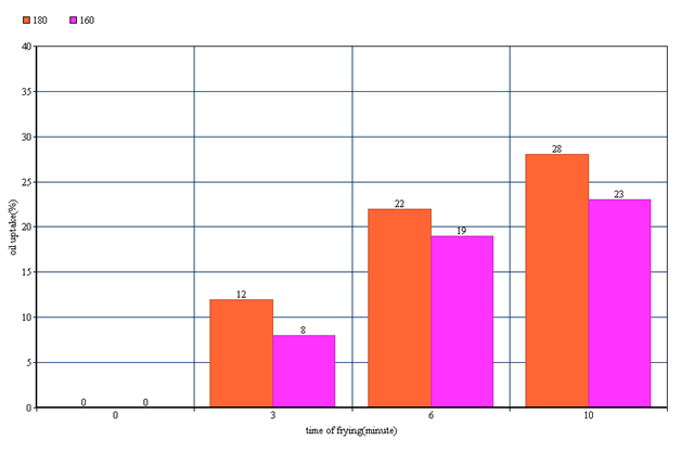 Our results showed that since moisture removal during frying is a key factor for oil uptake. Considering temperture of 180°C were more oil absorption than temperture of 160°C. But we were recommended 160°C frying temperture because had suitable texture, although temperture 180°C had high thickness of crust but contain high fat uptake %. Thus temperture of 160°C were better because low of oil uptake and enough thickness of crust.
