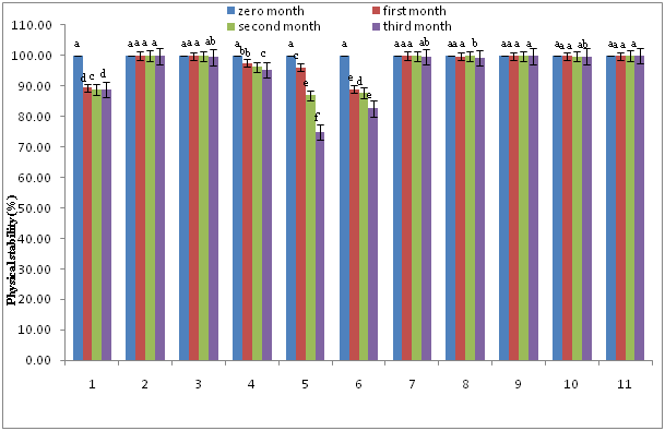 Figure 1 Changes in Physical stability, means in the same column indicated by similar letters were not significantly different (P>0.05). 1 = control sample.