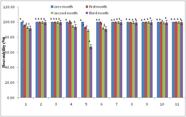Figure 2 Changes in heat stability, means in the same column indicated by similar letters were not significantly different (P>0.05). 1 = control sample.