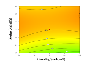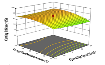 From Figure 1 & 2, the effects of cutting speed on cutting efficiency revealed that increasing the cutting speed from 25 to 43 m/min increased cutting efficiency from 65% to 88% at a constant plant moisture content of 23%, and then remained constant to 92% with subsequent increases to 55 m/min. This could be attributed to an increase in reciprocating speed causing an increase in impact force, cutting, and shearing actions of the blades. This is in line with the findings of a study published, which found that a harvester's field efficiency increases when the cutter bar reciprocating speed increases. On the other hand, the cutting efficiency remains constant with a variation in operating speed from 1.6 km/h to 2.4 km/h. There are insignificant effects on the cutting efficiency.