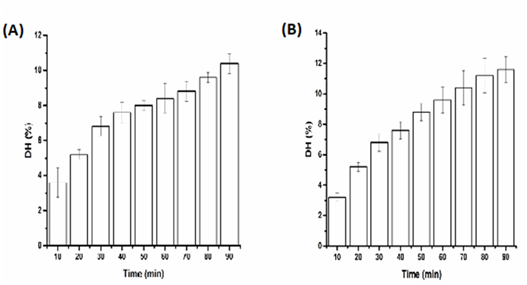 Figure 1 Effects of time on the DH of SP, ultrasound pretreatment with Single frequency (A) 20 KHz and (B) 28 KHz, enzymatic reaction at 50°C and pH9.