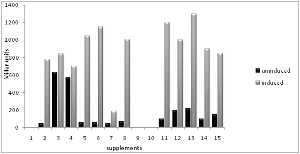Table 1 shows the bacterial populations (Log CFU/mL) found in commercial probiotic supplements tested in this study. The initial bacterial populations ranged from 3.87 to 9.50 log CFU/ml. Supplement 13exhibited the lowest number at 3.87± 0.40 log CFU/ml. Supplements 1, 25, and 15 exhibited the highest number with arrange of 9.12-9.50 log CFU/ml. These results indicate that the bacterial population varied among the tested products. This variation could be a result of several factors including the bacterial strains, the added ingredients and processing conditions. Several studies in our laboratory have shown that added indigents during fermentation and processing could enhance the viability of probiotic supplements including calcium and proteins.9,12-14 Figure 1 shows the β-gal activity of the fifteen commercial probiotic supplements both in the presence of glucose (uninduced) and lactose (induced). The activity of β-gal in the uninduced group ranged between 0 and 860 Miller unit/mL, and activity in the induced group ranged from 0to 1300Miller unit/mL. Several supplements exhibited relatively high β-gal activity levels ranging from 800-1300 Miller units;