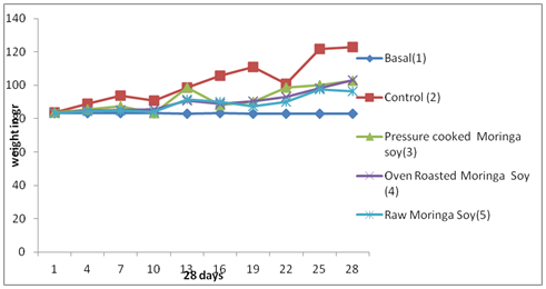 Mature unshelled Moringa oleiferaseed was collected for Obafemi Awolowo University Agriculture farm, Ile-Ife. The maize was soaked for one day, wet milled, made into dough and allowed to ferment for 48 hours, after which it was dried and milled into fine flour. Soy bean was also made into flour by first soaking for 48hr, blanched at 1000C, dehulled, oven dried at 800C, and milled into fine flour. Sample dietary was prepared Moringa oleiferaseed was cleaned, was at cooked at 1000C dried and milled into fine flour, Pressure cooked Moringa seed10%: soybean10%(3) Moringa oleiferaseed was cleaned sorted, oven dried at 800C, milled into fine flour Basal80%: Oven Roasted Moringa oleifera seed10: soybean10%(4), Moringa oleiferaseed was sorted, cleaned, sun dried, milled into fine flour, Raw Moringaoleifera seed10%: Soybean10%(5).The flours were packed into air-tight polyethylene bags and stored in the freezer5-7