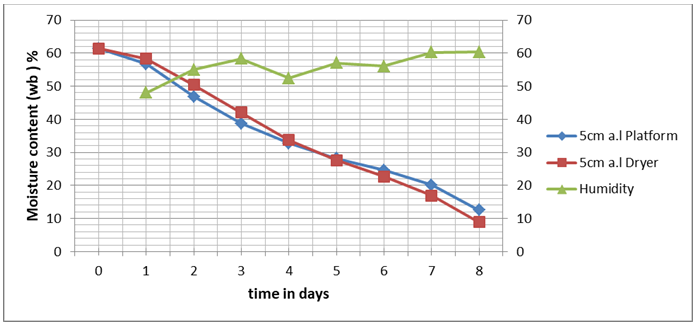 Figure 2 is moisture vs. time graph for 5 cm arc length cassava chips. The effect of humidity on drying can be shown by this Figure. When humidity is high, the drying rate is low and the drying rate increases with reduction in humidity. This is clearly observed on day 4 by the steep fall of the drying curves when humidity reduced.