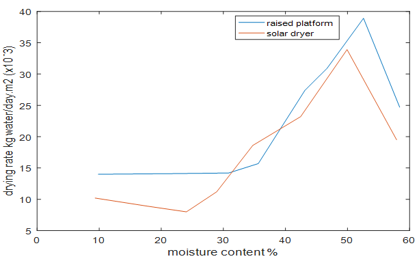 Figure 3 shows that drying rates were highest during the initial stages for both the raised drying platform and solar dryer. This could be attributed to the fact that during the initial stage of drying the water lost from the cassava chips is largely the water on the surface of the chips. Once that water has been evaporated, the rate of evaporation of water from the chips begins to decrease since water must move through the material to the surface in order for drying to continue.11 However, it is also observed that drying rate was low when moisture content was above 50% and this was on day 1. This can be explained by the short drying duration on day 1 since sample preparation (harvesting, peeling, washing and slicing) was first done and the samples were laid on drying beds at around 2 pm and dried up to 5 pm.