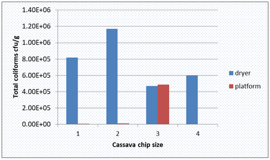 From Figure 6, it is observed that samples dried on the raised platform had less Total Plate Count than those dried in the solar dryer. Total Plate Count being the total number of viable microbes in a food product, the low values for the raised platform imply that samples dried on it were less contaminated than those dried in the solar dryer. ANOVA test of Total Plate Count and Total Coliforms for both the dryer and raised platform showed no statistically significant difference of the effect of chip sizes (p>0.05).This implies that other factors other than cassava chip size affected Total Plate Count and Total Coliforms. Such factors could be hygiene and sanitary practices observed during the drying process.