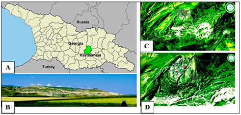 Figure 1 (A) Kavtiskhevi limestone quarry located is in Shida Kartli region of Georgia. (B) Kavtiskhevi limestone quarry. (C) Limestone quarry with study sites (red and green spots). (D) Research plots of pioneer successions (PS) and oligotrophic grasslands (OM) successions.