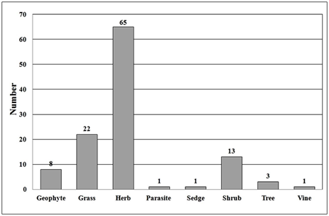 Figure 2 Plant diversity is in Kavtiskhevi limestone quarry. Number of plant species of different life forms in four habitats of the study area (N=114).