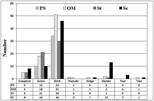 Figure 3 The number of life forms of vascular plant species in study habitat types: pioneer primary succession (PS); logistic succession oligotrophic meadows (OM); secondary steppes (St) and dry xerophytic scrubland (Sc). (N=114).
