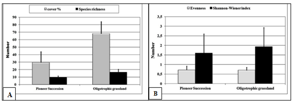 We have compared vegetation cover, species richness and biodiversity indexes between pioneer successions located at the mineral extraction sites before 2‒3 years and restored oligotrophic grasslands covering areas of the mineral extraction sites after 5 years of naturally restoration process of the vegetation in the Kavtiskhevi limestone quarry of ‘Heidelberg Cement AG’. Both pioneer successions and oligotrophic grasslands are characterized by low dry matter yields which can be explained through the reduced quantities of rainfall from spring and, of course, through with the reduced tornadoes of soil. Dominant species of the naturally restored grasslands in the Kavtiskhevi limestone quarry was used for determination of the abundance distribution among species in plots of the pioneer successions and naturally restored oligotrophic grasslands.7 Species abundance patterns in different tropical successional stages provide the niche in groups of species that are closely associated ecologically in the same microhabitats. The first group of dominant species is‒Artemisia alpina, Bothriochloa ischaemum, Dorycnium pentaphyllum subsp. herbaceum, Glycyrrhiza glabra, Inula aspera, Lotus corniculatus. The second group contains species‒Festuca varia, Lolium rigidum, Onobrychis radiata, Plantago lanceolata, Poa pratensis, Poterium polygamum, Teucrium chamaedrys, Trisetum rigidum, etc.