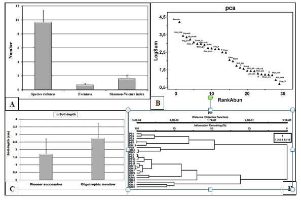 Detrended correspondence analyses (DCA) show that the pioneer succession are mainly clustered in right segment of first axis area with environmental indicator of low soil depth and the oligotrophic grassland plots are concentrated in the area with more higher soil depth and litter occurrence. There are only four plots of pioneer succession with higher soil depth and they are clustered in left segment of the first axis. One oligotrophic plot (OM6) is associated with lower soil depth. The mean soil depth (Figure 5C) in pioneer succession plots is lower (1.7±1.76cm) than in oligotrophic grasslands (2.75±1.13cm).