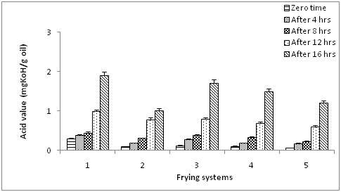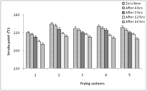 Figure 3 shows the changes in smoke point of fried oils and their blends at various periods compared with those at zero time. Value of smoke point of fried olive oil was gradually decrease compared with sunflower oil. It is worth noting that the smoke points of fried olive oil mixed sunflower oil at variance levels were generally higher than olive oil alone.