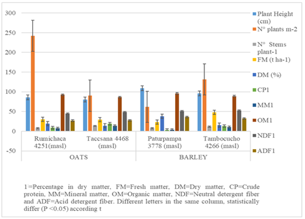 The number of plants per m2 was higher in Rumichaca than in Taccsana, while the number of Stems was higher in Taccsana than Rumichaca (Table 1). The fresh matter production (FM) was similar (P>0.05) in both locations with an average production of 30 t ha-1, equivalent to an average production of 5.004 t ha-1 of DM. The production of DM (5.004 t ha-1) is less than 10.269 t ha-1 of DM reported by Montoya QK, et al.,(2017),16 who worked at an altitude of 3313 masl (lower than the present study, 4251 masl and 4468 masl) in four varieties of oats (centennial, Mantaro 15, INIA 2000 and INIA Santa Ana), harvesting grass grain in the phenological state, but similar to 6.028 t ha-1 of DM found by Contreras JL, et al.,(2019),17 who worked at altitudes of 3670 masl in oats variety Mantaro 15, allowed better productive parameters in dry forage yields.