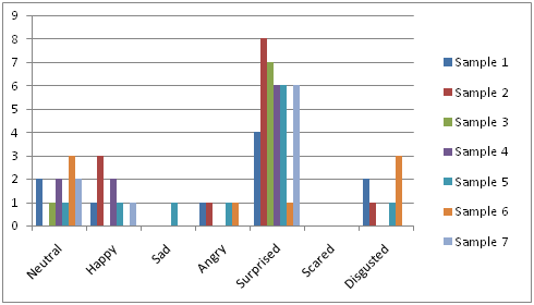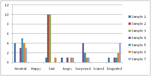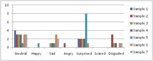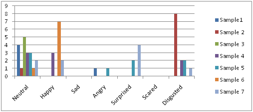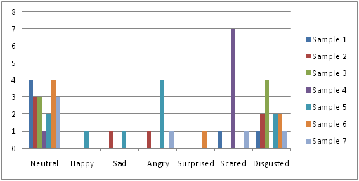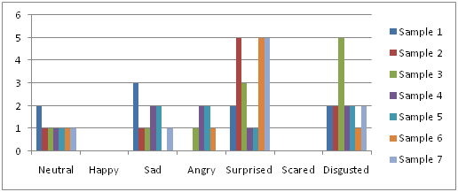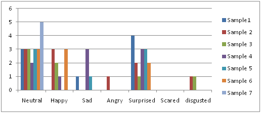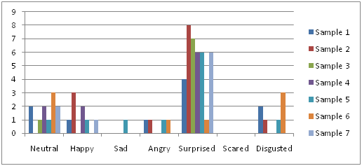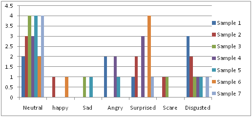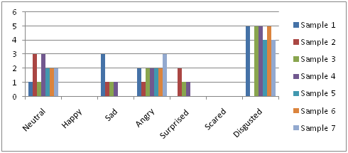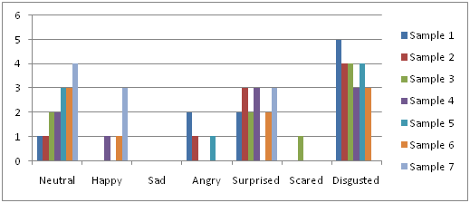 For the sensory evaluation process we used the Multivariate Analysis of Variance (MANOVA) the data represent the 7 face expressions that are expected during tasting the 7 samples and the number of participants who gave the same face expression during tasting each sample; Figures 1-20 shows the results of each face expression scale by each participant. We used the Analysis of Covariance (ANCOVA) to test the average of each face expression for all participants that presented in Figure 21.