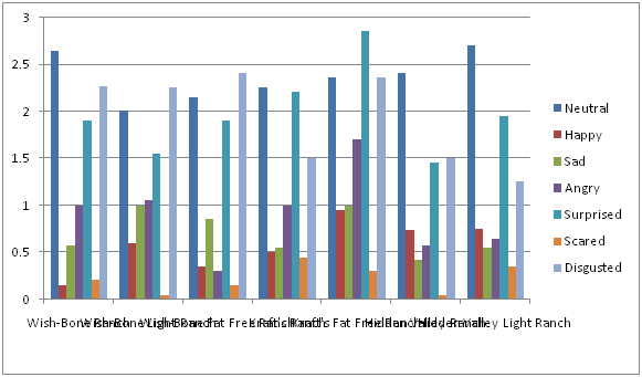Results: The results showed that Wish-Bone Ranch and Hidden valley Light Ranch shows the highest records for neutral face expression, Kraft’s Fat free ranch shows the highest record for happy face expression, Wish-Bone Light Ranch and Kraft’s fat free Ranch shows the highest record for the sad face expression, Kraft’s Fat Free Ranch shows the highest record for the Angry expression, Kraft’s Fat Free Ranch shows the highest record for the surprised expression, Kraft’s Ranch shows the highest scale for the Scared expression, and Wish-Bone Fat Free Ranch shows the highest scale for the Disgusted expression.