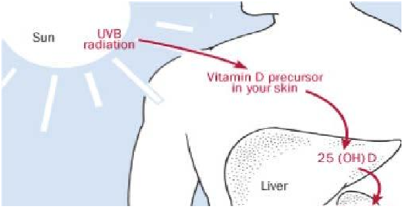 There are many sources from where we can absorb the vitamin D. It is commonly known that the sun is the main natural source of vitamin D. The majority of people obtain some of their vitamin D through the sunlight. The sunlight is consisted of ultraviolet (UV) radiation. This radiation has a wavelength of 290-320 nanometres.8 Researchers have shown that the skin pigmentation depends, in a large scale, on the melanin of skin. Many case studies have shown that the human melanin is responsible for the production of vitamin D3 after the UV radiation. The first stage of vitamin’s D metabolism happens in the liver.7