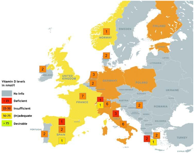 The Europe and especially the Mediterranean countries, regarding their warm climate, have plenty of sunlight exposure, in comparison with Northern countries. The period of summer gives the ability to the people to absorb suitable amounts of vitamin D. Despite the fact that the sun is adequate in these countries, the insufficiency of vitamin D is a common global health issue.4