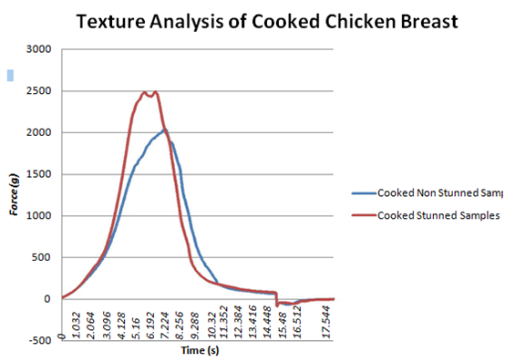 In the raw chicken samples, more blood spots were observed in the non-stunned chicken breasts as compared to the stunned. A darker colour due to multiple bruising was also observed on the raw non-stunned chicken samples, whilst the stunned samples were paler in colour (Figure 3.1) (Figure 3.2) & (Figure 4.1) (Figure 4.2). On the cooked samples, the stunned chicken breast reportedly had a stronger and more metallic odour than the non-stunned chicken breast. Tenderness, flavor and juiciness were more preferable with the non-stunned chicken breast as it had a sweeter flavor, more moist and was softer than the stunned chicken breast. Although both were of acceptable eating quality, the non-stunned chicken breast was unanimously preferred on overall acceptability. These results correlate with the objective quantitative texture analysis data (Figure 1).