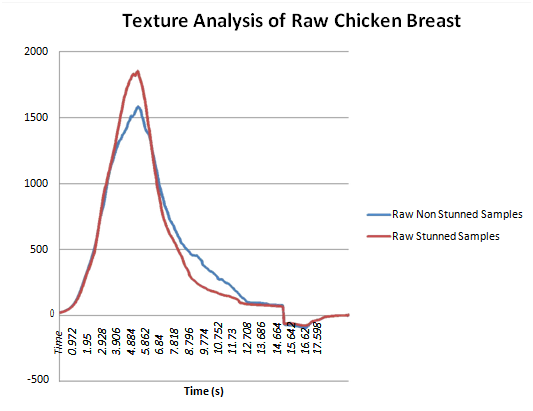 The peak force of the cooked stunned samples was higher than the cooked non-stunned samples with peak force means of 2929.0g and 2403.0g respectively (Figure 1). The difference between the two samples were found to be significant (p<0.003). The peak force of the raw stunned samples was higher than the raw non-stunned samples with peak force means of 1853.8g and 1584.7g respectively (Figure 2). However, the difference between the two samples were not significant (p>0.05).