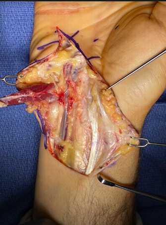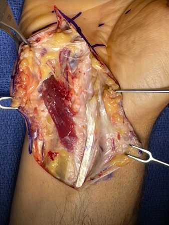 Figure 2 Palmaris brevis muscle released from palmaris longus demonstrating ulnar neurovascular bundle.
